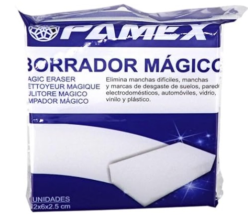 Esponja borrador mágico de resina de melamina que elimina fácilmente manchas difíciles de distintas superficies; paredes, interruptores, puertas, mesas y azulejos. Limpia solamente con agua. Sin esfuerzo.